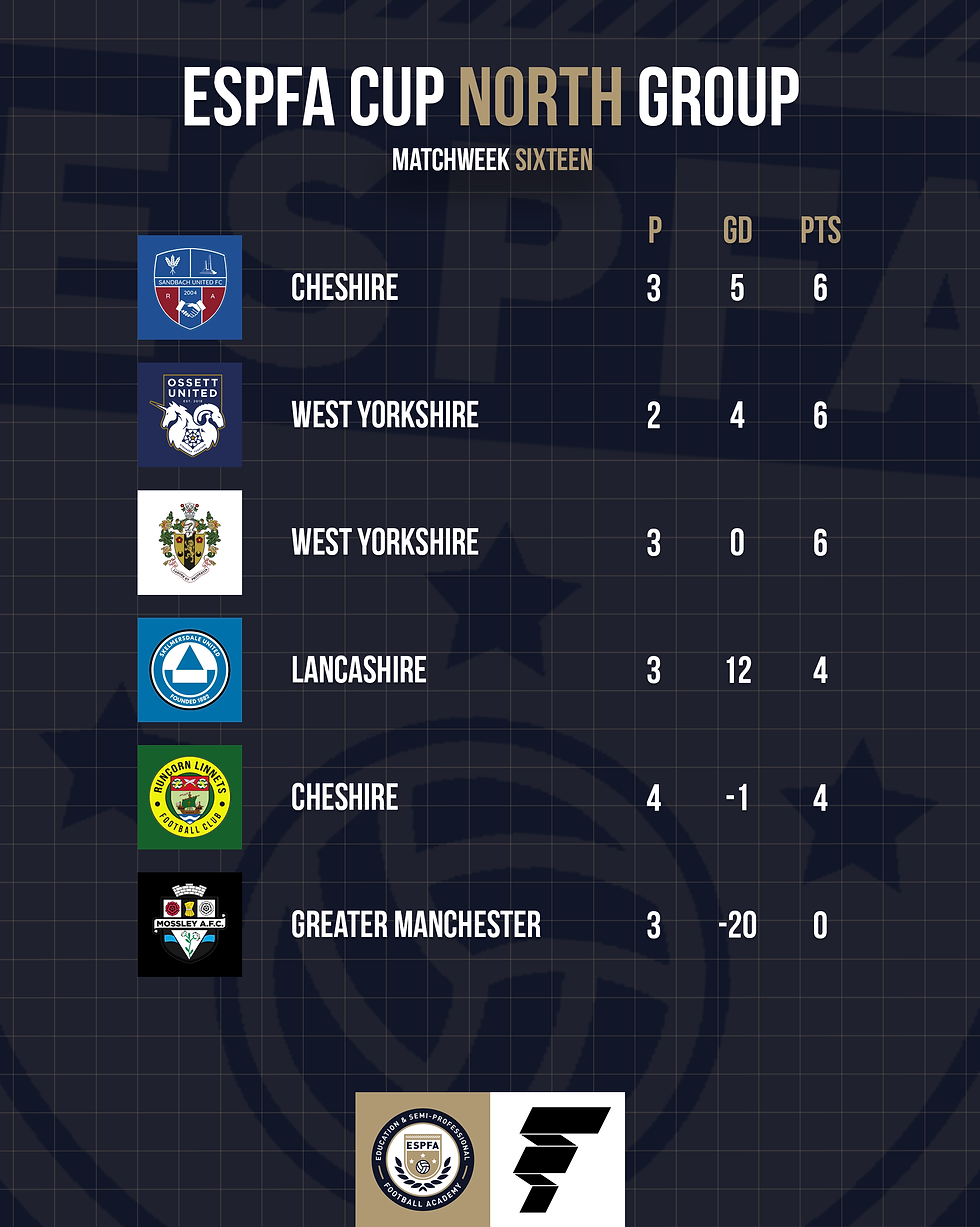 REVIEW 2025/26 - Matchweek SixteenESPFAFeb 171 min readRESULTS & GOALSCORERSMATCH PHOTOGRAPHS FROM THE FEATURE GAME (Full set on facebook.com/ESPFAcademy)TEAM OF THE WEEKLEAGUE TABLESCUP GROUPSGOALS SHOWhttps://www.youtube.com/watch?v=ARp3DghRgNIINSIDE ESPFA - MATCHDAYCLICK HERE TO VIEWTEAM LINEUPS